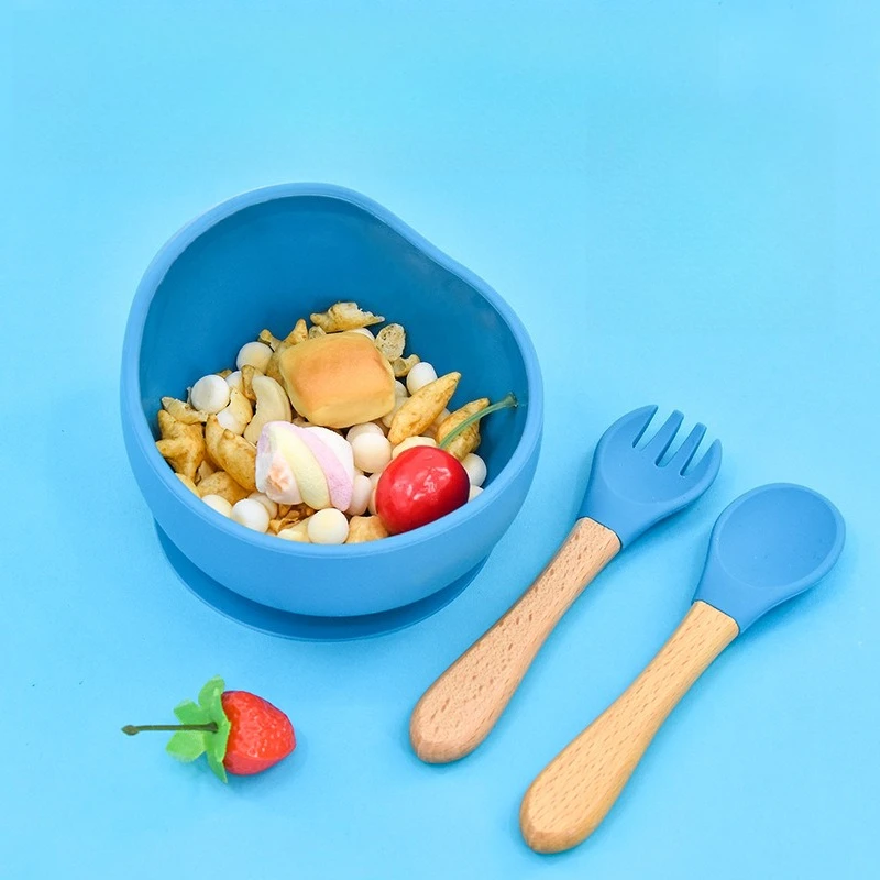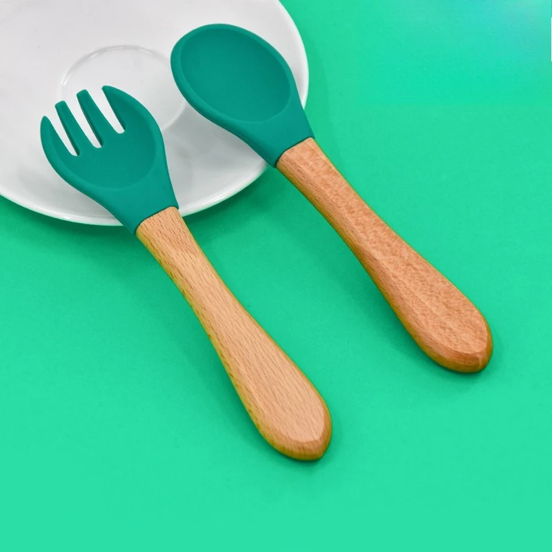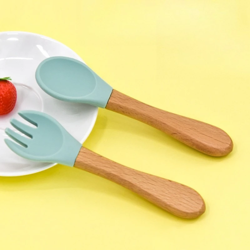 2 unids/set vajilla juego de tenedor cuchara para bebé entrenamiento de alimentación de madera de silicona para niños vajilla para bebé cubiertos suministros de alimentación de bebé (v1.12.4)