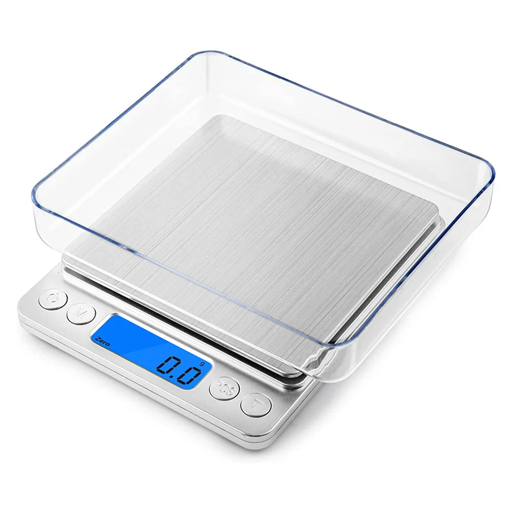 3: Multifuncional: la báscula de precisión tiene 2 bandejas transparentes (5,11 pulgadas, 3,94 pulgadas) y 2 pilas AAA (no incluidas), que se pueden usar como contenedores de pesaje o tapas para proteger la báscula de bolsillo de la suciedad.Esta báscula es muy adecuada para hornear, cocinar, controlar porciones, recargar sellos, joyas y experimentos de laboratorio sencillos.