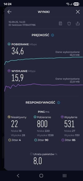 Ruter w sieci Play działa dobrze pobieranie 35 Mbps wysyłanie 15 Mbps kilometr od nadajnika BTS z Play. Zasięg full przed domem a w domu o jedną kreskę mniej (4G LTE). Wszystko zgodne z opisem telefon S25 Ultra wykrywa jako WIFI6. 15m od domu zasięg WIFI spada o jedną kreskę.