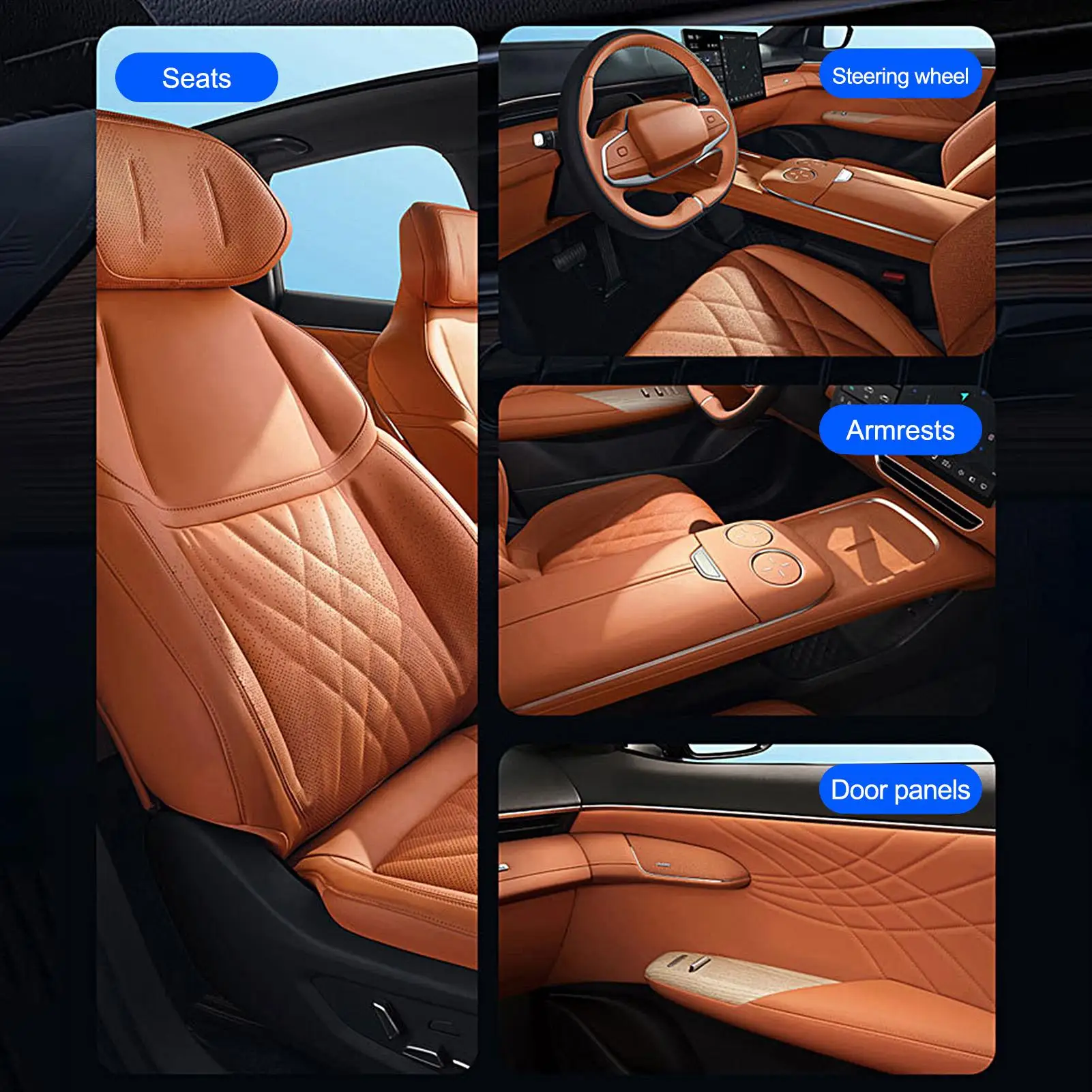 3.Restauración de acabado brillante: el limpiador de cuero para el interior del automóvil revitaliza las superficies del cuero eliminando los signos de desgaste y opacidad, creando un efecto luminoso natural que mejora las imágenes generales de la cabina, asegurando una atmósfera acogedora tanto para los pasajeros como para los conductores.
