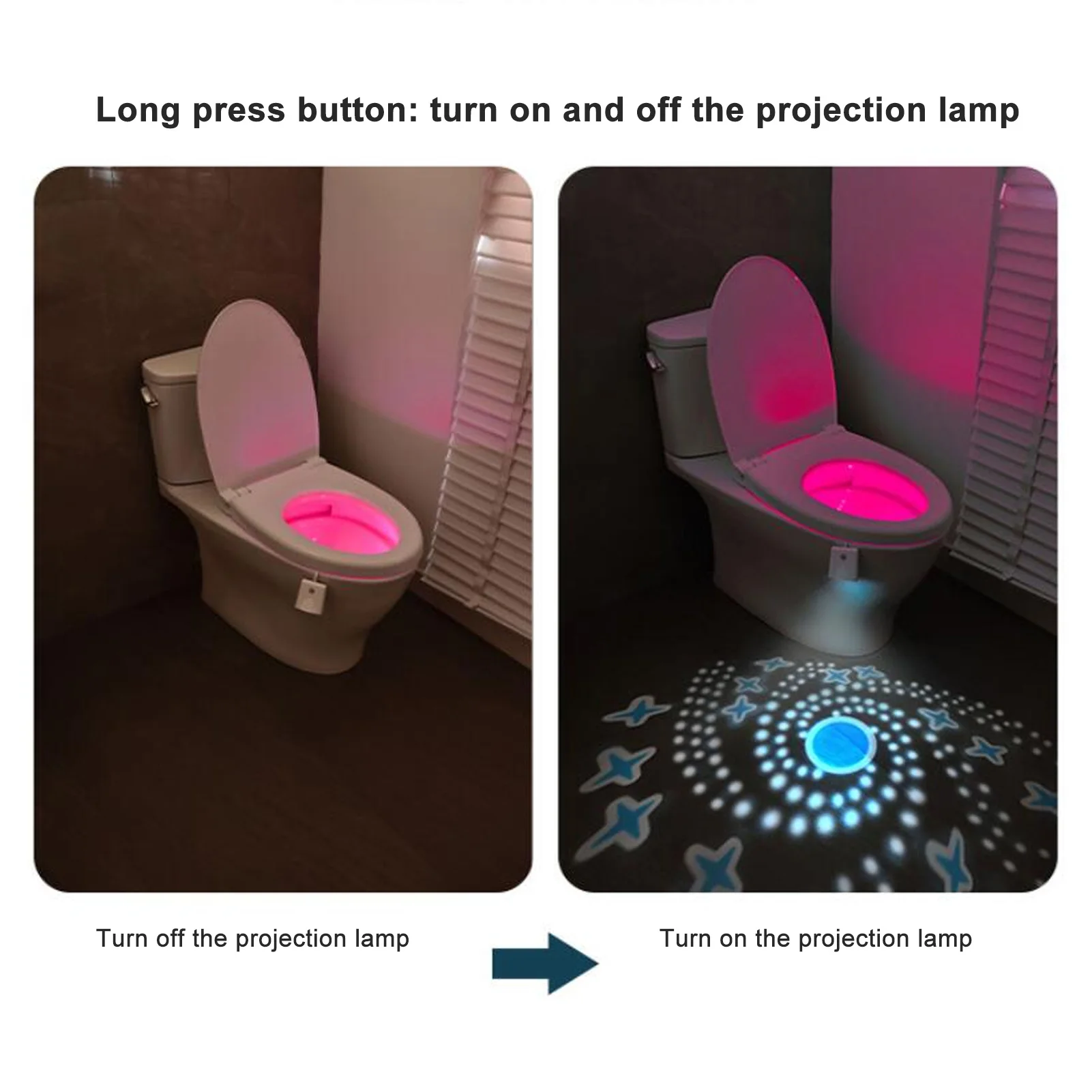 Features 1、MOTION SENSOR: Superior motion detection technology detects motion within 5 feet and automatically turns on the night light. If no motion is detected, it turns off after 90 seconds, eliminating the need for manual operation and extending battery life. 2、16 LED COLORS, PROJECTION LIGHT: 16 colors can be selected by control for gradient or single color fixation. Long press to turn on the bottom projection light, the projected light pattern is more unique and cozy. 3、HEAD CABLE: It is malleable, soft and waterproof, won’t break easily due to excessive bending, and can be hung anywhere you want to hang it. 4、SIMPLE OPERATION: One touch switch operation, single click (power on, color light single color fixed color, color light gradient color). Long press (white light projection lamp on, off). Quickly press 3 times in a row (power off). 5、NOVELTY GIFT: Give this toilet light as a gift to your friends to impress them, it will also be the most cozy present for old people, children.