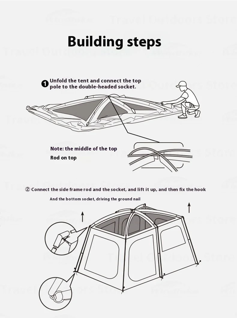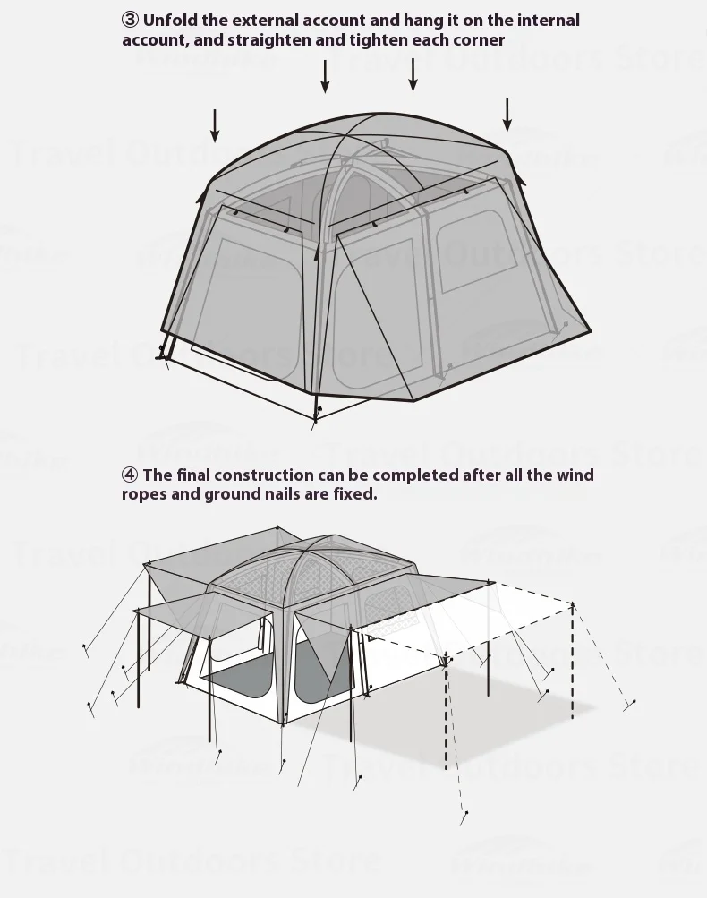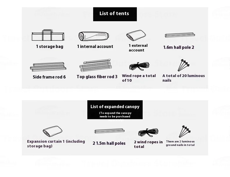 Expansion curtain 1 including storage bag,2 1.5m hall poles,2 wind ropes in total,There are 2 luminous ground nails in total