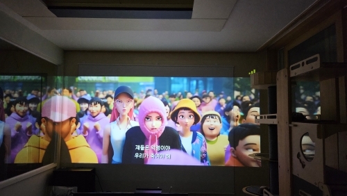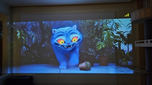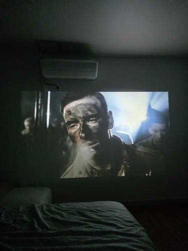 비오는 날 배송 됐지만 완벽한 포장에 안심했습니다. 어디서부터 뜯어야 하나 고민했을 정도로 포장이 굉장했습니다. 기존에 쓰던 700안시 제품과 비교하면 밝기가 매우 뛰어납니다. 밝기와 선명도가 확실히 높네요. 사진은 어두운 상태와, 조명을 켜둔 상태에서 사용한 모습입니다. 간접등 정도는 문제없으니 tv처럼 사용 가능하네요. 자체 os는 별로라서 안드로이드tv 스틱을 이용하는게 낫습니다. 그리고 초기 색상 설정이 조금 과장 돼서 조정이 필요해요. 색상 설정은 기본 설정메뉴에는 없고, 리모콘 막대기 3개 버튼을 길게 누르면 팝업처럼 화면에 표시 됩니다. (판매자분께 문의를 해서 알게 됐습니다. 친절 하셨어요) 낮은 안시의 제품은 고휘도 스크린이 밝기 보강으로 좋지만, 이 제품은 1.0gain 매트 화이트 스크린을 쓰시는걸 추천 드립니다. 기본 밝기가 좋아서 충분히 성능 발휘도 하고 시야각이 넓어져서 이득이 더 많습니다. 고휘도 스크린을 쓰시는 분들은 스크린 뒷벽에 블랙 매트 원단이나 페인트칠이라도 하고 쓰시면 됩니다. 밝기가 높아서 생길수있는 빛번짐을 막아주고 선명도를 대폭 높여줍니다. 의문점: 밝기 설정을 해둬도 껐다켜면 auto로 돌아가있네요. 아쉬운점: 렌즈 커버가 없습니다. 울트라는 있던데….. 장점: 다른 저가형 제품들이 생략하던 전원 끄고 일정시간 냉각 기능이 있습니다. 기기의 수명에 매우 큰 역할을 하는 기능이에요. 관세 문제만 아니면 울트라를 사려고 했는데, mini도 성능이 나쁘지 않아 만족중입니다. 추천 합니다. * 사진속 스크린은 130″ 이고 거리는 3.3m입니다.