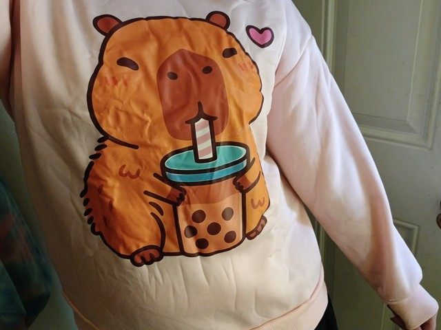 Arrived on time, exactly as advertised. Good quality, made well. Only complaint is that the decal is more orange than tan unlike the one advertised. Also the sweater is a different shade of pink. However it is very comfortable and fits perfectly.