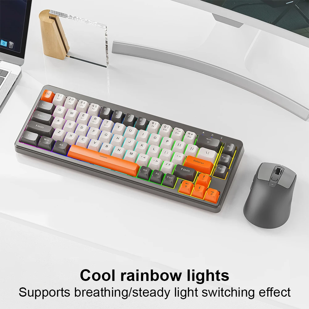 1.Diseño compacto:Este teclado mecánico inalámbrico de 68 teclas, con teclas de flecha y una tecla “FN” para una funcionalidad completa, maximiza el espacio del escritorio y conserva todas las funciones esenciales.