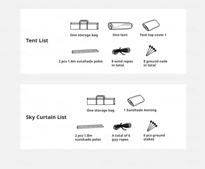 One storage bag,1 Sunshade Awning,2 pcs 1.8m sunshade poles,A total of 6 guy ropes,6 pcs ground stakes