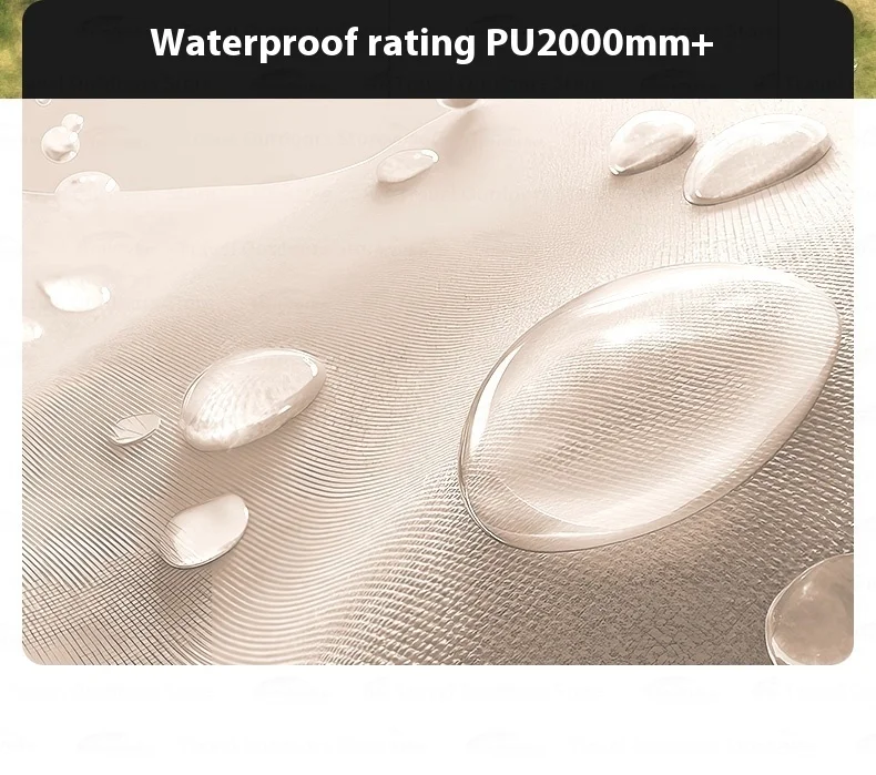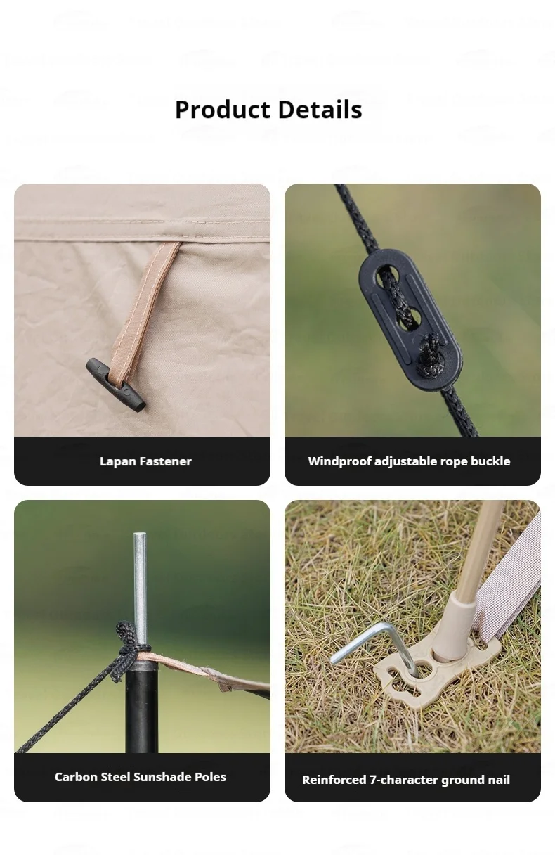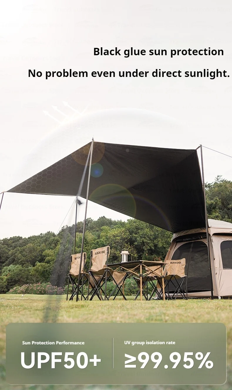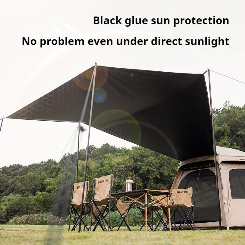Material: tela Oxford 150D (recubrimiento negro), postes de fibra de vidrio, postes de toldo de acero al carbono