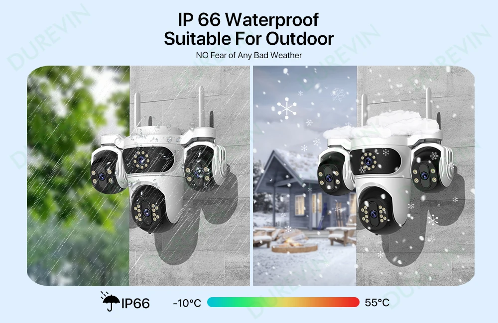 Esta cámara PTZ WiFi tiene un cuerpo y una carcasa sólidos, la clasificación de impermeabilidad de nivel IP66 la hace ideal para vigilancia en exteriores.Puede soportar condiciones climáticas adversas.incluyendo lluvia, nieve, frío intenso y calor.