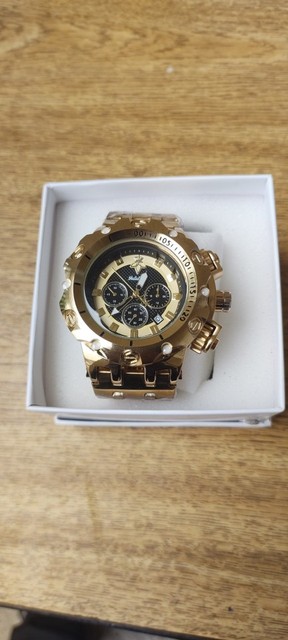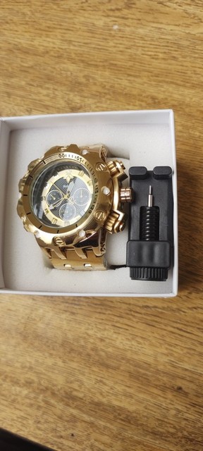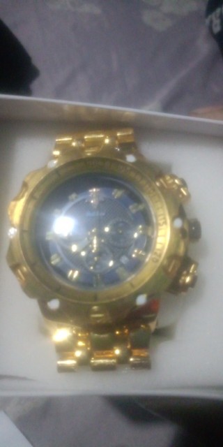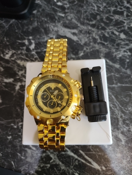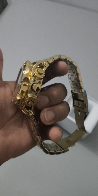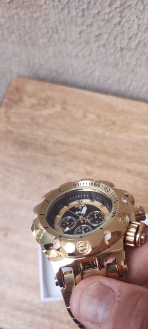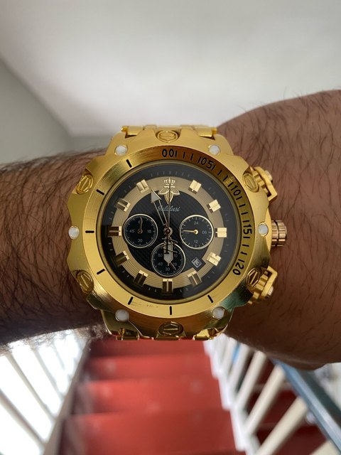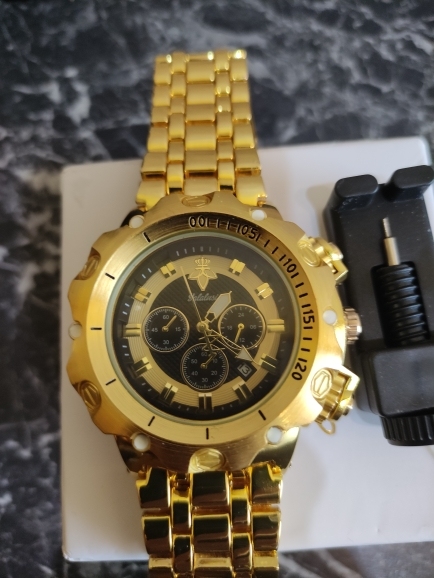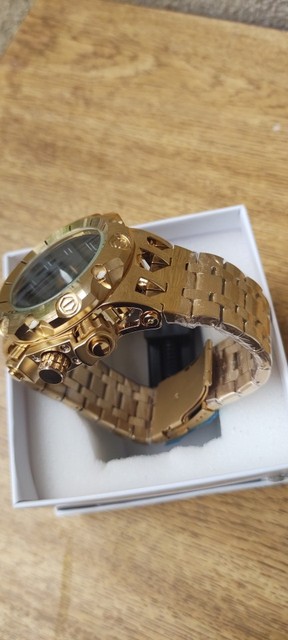 First of all: awesome seller, fast reaction cooperative, nice guy. The watch arrived very fast and securely. This monster watch (+300gr weight) is almost completely made of thick, chrome layered brass; strap, housing (which is made of 3 separate pieces) and the back cover (although it says „stainless steel“ it is brass). Thick glas, steel clasp (which is slightly different in color). The bezel and the rings covering the chrono buttons are probably made of zinc alloy. The heart is a Sunon PE60, a cheap to replace, reliable movement. For a price between 20-30€ this is a very very nice, eye catching watch. If you do not want to spend 600-1000€ for an original Invicta, this is the right seller. The back cover has an o-ring but there is no o-ring on the crown, so dont try to go into water with it, you will destroy the movement and probably go down like you carry an anchor. All in all a very good price-performance-watch. I own a lot of watches, but this one is something special.